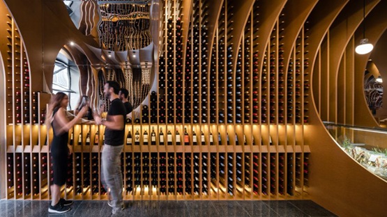 在内部,酒架在空间两侧排列,周围环绕着弯曲的建筑元素和家具,这些设计用来呼应酒瓶、酒桶和旧酒窖拱形天花板的形状。