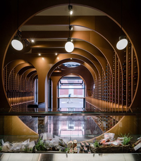 除了让人联想“古代地下室”的拱形天花板外,这些镶板还形成了拱门和窗户,这些拱门和窗户划分了店内的各个区域,如柜台、品尝台和展销空间。