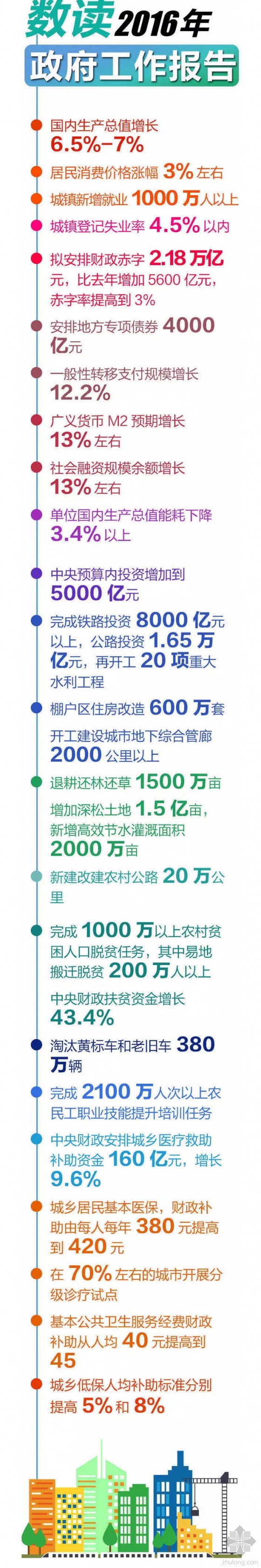 三、2016年重点工作9、全面实施营改增,从5月1日起,将试点范围扩大到建筑业、房地产业、金融业、生活服务业,并将所有企业新增不动产所含增值税纳入抵扣范围,确保所有行业税负只减不增。10、壮大网络信息、智能家居、个性时尚等新兴消费;加快建设城市停车场和新能源汽车充电设施;加强旅游交通、景区景点、自驾车营地等设施建设。11、今年要启动一批"十三五"规划重大项目。完成铁路投资8000亿元以上、公路投资1.65万亿元,再开工20项重大水利工程,建设水电核电、特高压输电、智能电网、油气管网、城市轨道交通等重大项目。中央预算内投资增加到5000亿元。12、加快农业转移人口市民化。深化户籍制度改革,放宽城镇落户条件,建立健全“人地钱”挂钩政策。扩大新型城镇化综合试点范围。发展中西部地区中小城市和小城镇,容纳更多的农民工就近就业创业。13、今年棚户区住房改造600万套,提高棚改货币化安置比例。完善支持居民住房合理消费的税收、信贷政策,适应住房刚性需求和改善性需求,因城施策化解房地产库存。建立租购并举的住房制度,把符合条件的外来人口逐步纳入公租房供应范围。14、加强城市规划建设管理。增强城市规划的科学性、权威性、公开性,促进"多规合一"。15、开工建设城市地下综合管廊2000公里以上。积极推广绿色建筑和建材,大力发展钢结构和装配式建筑,提高建筑工程标准和质量。打造智慧城市,改善人居环境,使人民群众生活得更安心、更省心、更舒心。16、优化区域发展格局。深入推进"一带一路"建设,落实京津冀协同发展规划纲要,加快长江经济带发展。制定实施西部大开发"十三五"规划,实施新一轮东北地区等老工业基地振兴战略,出台促进中部地区崛起新十年规划,支持东部地区在体制创新、陆海统筹等方面率先突破。促进资源型地区经济转型升级。支持革命老区、民族地区、边疆地区、贫困地区发展。17、加大农村基础设施建设力度,新建改建农村公路20万公里,具备条件的乡镇和建制村要加快通硬化路、通客车。建设美丽宜居乡村。继续推进贫困农户危房改造。18、全面推进城镇污水处理设施建设与改造,加强农业面源污染和流域水环境综合治理。19、支持推广节能环保先进技术装备,广泛开展合同能源管理和环境污染第三方治理。加大建筑节能改造力度,加快传统制造业绿色改造。开展全民节能、节水行动,推进垃圾分类处理,健全再生资源回收利用网络,把节能环保产业培育成我国发展的一大支柱产业。