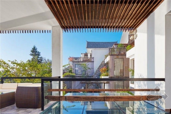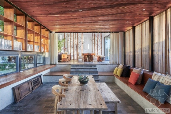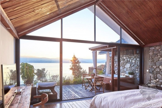 当然,守着洱海这片天然美景,设计团队自然不会放过这个借景的好机会。怎么才能跨过酒店前的马路一览洱海美景呢?他们采用了一个半下沉的公共空间,空间下面通过隔墙低下来的地方,可以建立与水景的心理联系,空间上面设计了一个平台,建立起与洱海水景更为直接的关系。这个平台用了钢结构,右边所接的建筑是开敞的,让二楼更有一种地景感而不是建筑感,而从马路上回看酒店,建筑也显得更加空灵、轻巧,不像周边房子那样很实。