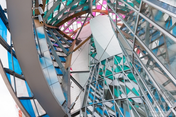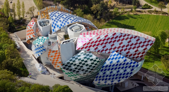 在艺术家Daniel Buren的设计下,由弗兰克·盖里设计的巴黎路易威登基金会的白色玻璃弧形船帆有了丰富多彩的色彩,更确切地说是13种颜色。与夏季十分搭配。Buren设计的临时格子,是与弗兰克·盖里联合开发的,名为“光之瞭望台(The Observatory of Light)”。该建筑的3528块玻璃板均使用了染色过滤器以及8.7厘米宽的白条,历时29个晚上,超过5个星期。