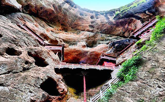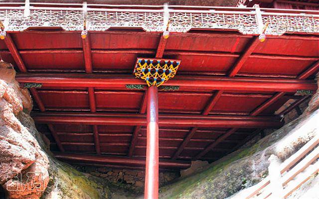 甘露寺将地理上的劣势变为建筑上的优势,运用卯榫进行连接,不用一根铁钉,将寺庙牢牢地固定在赤石深壑之中。左边红色岩石象一口硕大无比的“钟”,右边岩石像一面独步天下的巨“鼓”,民间称为“右鼓左钟,庙(妙)在其中”。