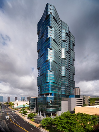 38层的“阿纳哈大厦”的表面是蓝绿色玻璃幕墙,选择模仿附近的太半洋的颜色。