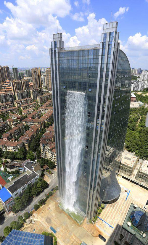 高楼景观瀑布是由裂变广场设计的,楼层总高有121迷,瀑布设计高度为108米。该瀑布是贵阳市唯一的瀑布大厦,也同时是全国唯一存在的瀑布大楼。该大楼从此成为贵阳市一道奇景,来到贵阳市旅游的游客必去的一个地方。