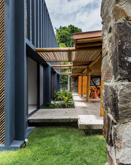 在巴西的这座住宅的深色的竖直“肋骨”之间,竹板条被斜斜地放置在一起。