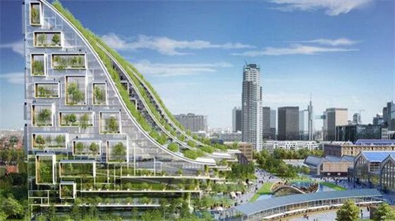 住宅区以三座类似滑雪跳台的景观建筑为中心。建筑上方的垂直花园,郁郁葱葱的绿色景观将曾经的湿地变成了一处花园天堂。