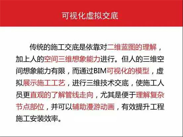BIM突破了二维图纸的限制,直观的反应施工所要达到的效果,有效的弥补了二维图纸的不足。但是在实际施工当中,并没有达到百分百与模型契合,存在一定的不足。原因在于,一方面受交叉施工工序影响,没有完整的工作面来实现模型;一方面受其他专业变更影响,例如土建二次墙体更改会影响机电管线路由走向。这些问题往往在BIM深化中考虑的较少,这也是我们下一步拓展工作的重点。