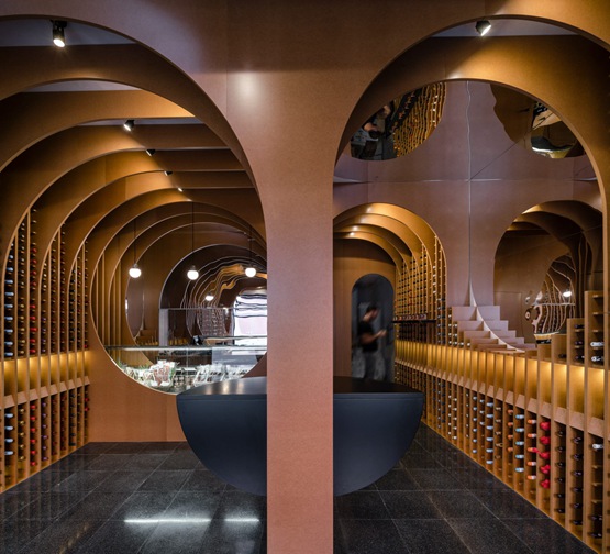 一个模仿拱门弯曲形状的椭圆形镜子面板爬上其中一面墙,延伸到品酒室的天花板上,形成周围酒架的扭曲反射。
