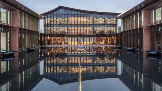 日清设计公司表示:“休闲中心采用不对称的空间模式,将内部空间和景观结合在一起,创造出一种传统的空间模式,让人联想到苏州园林的风格。”