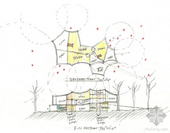 斯蒂芬•霍尔建筑师事务所受富兰克林与马歇尔学院(美国宾夕法尼亚州兰开斯特市)委托,设计一座新的视觉艺术教学楼及方院,以促进校园未来的艺术发展。该方案的设计灵感来自环绕建筑的树丛,霍尔称其为“公园中的展馆”,如同树丛中的风筝。