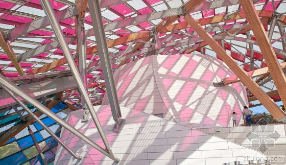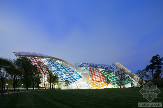 在艺术家Daniel Buren的设计下,由弗兰克·盖里设计的巴黎路易威登基金会的白色玻璃弧形船帆有了丰富多彩的色彩,更确切地说是13种颜色。与夏季十分搭配。Buren设计的临时格子,是与弗兰克·盖里联合开发的,名为“光之瞭望台(The Observatory of Light)”。该建筑的3528块玻璃板均使用了染色过滤器以及8.7厘米宽的白条,历时29个晚上,超过5个星期。