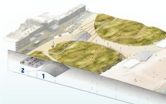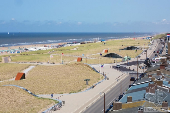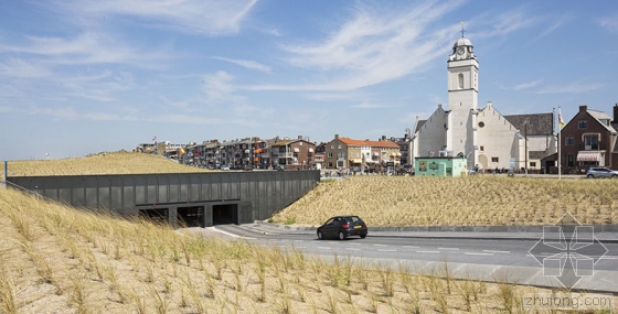 为了解决这两个问题,Katwijk 市政府在 2008 年拨款 7000 万欧元,发起了一项名为“Kustwrk Katwijk”(意为 Katwijk 海事)的、1500 米长的防洪堤坝改造工程。新方案如项目 Logo 所示,是在沙丘下加入了两个并列结构——停车场和防洪墙。将停车厂藏在沙丘下的创意是由 Zwarts & Jansma Architects, Royal HaskoningDHV, 和 OKRA Landscape Architects 这三家机构首先提出来的。这个新停车场有 670 个车位,节省了大量地面空间,但问题是如何同时提升沙丘的防洪能力。防洪墙因此也被加入沙丘中。这个概念被称为 Dike in Dune(丘中坝),它提升了整体防洪系数,同时也允许适当降低沙丘高度,让沿海公路上的人欣赏到海景。