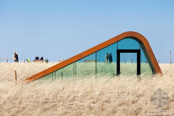 那如何让这个停车场出入方便呢?负责景观设计的 OKRA 在面向沿海公路的一侧设置了 2 个车辆出入口,它的外形类似穿山隧道的入口,各有三个车道。面向海滩、紧靠人行道的一侧,则开设了 5 个行人出入口,装有全玻璃门。这个设计相当于将公路和海滩从地下打通,来玩的人停完车直接就可以到达海边,无需像原来那样走一大段路。为了保证美观,行人出入口均顺着山丘走势被设计成弧形,略微高出路面,完全融入到沿海景观中。白天,玻璃门辅助增强出入口照明;夜晚,内部照明则同时扮演了路灯的角色。