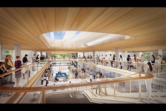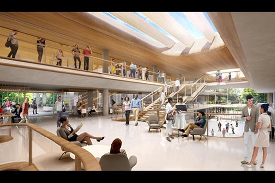 环保设计,员工健康是中心主题,这幢建筑的活动地板可以改善空气质量,还有广泛的循环利用设施和1.3公里的林中跑道。