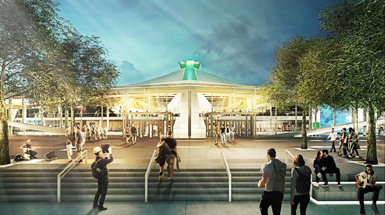 在西雅图,一个玻璃中庭将用来展示一个多功能竞技场的倾斜屋顶,这是博普乐思建筑事务所(Populous)翻新这座60年代建筑的计划的一部分。