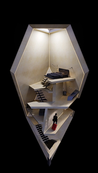 “混凝土豆荚酒店”套房的内部将布置多个由楼梯连接的平台。一张双人床可以安放在一个大天窗下面的最上面的平台上,下面有一个浴室。