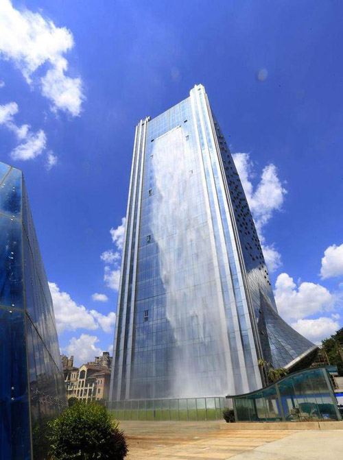 高楼景观瀑布是由裂变广场设计的,楼层总高有121迷,瀑布设计高度为108米。该瀑布是贵阳市唯一的瀑布大厦,也同时是全国唯一存在的瀑布大楼。该大楼从此成为贵阳市一道奇景,来到贵阳市旅游的游客必去的一个地方。