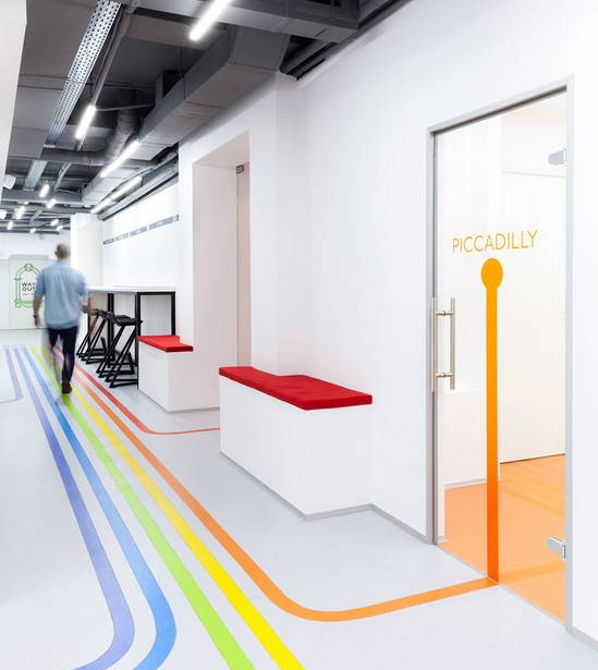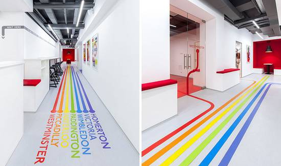 地面上呈现出彩虹的线条,上面写着类似伦敦地铁的目的地,比如威斯敏斯特,皮卡迪利大街,帕丁顿等。跟寻着不同的色彩线条,你将进入不同主题空间的教室。