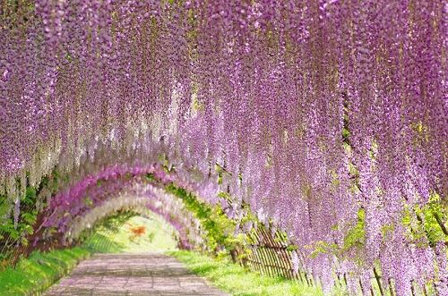 位于北九州的河内富士花园(Kawachi Fuji Garden)中有一条18米高,完全被紫藤萝花覆盖的长廊。行走在长廊中,藤萝在头顶交织,紫色的华光如瀑布般倾泻而下,让人不禁醉倒在这片梦幻的花天景观之下。