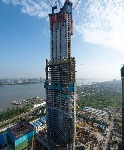 随着主塔楼核心筒第61次顶升作业完成,由中建三局二公司承建的华中第一、中国第二、世界第三高楼——武汉绿地中心主体结构高度突破300米大关,高度达302.65米。