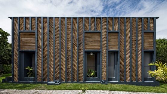 在巴西的这座住宅的深色的竖直“肋骨”之间,竹板条被斜斜地放置在一起。