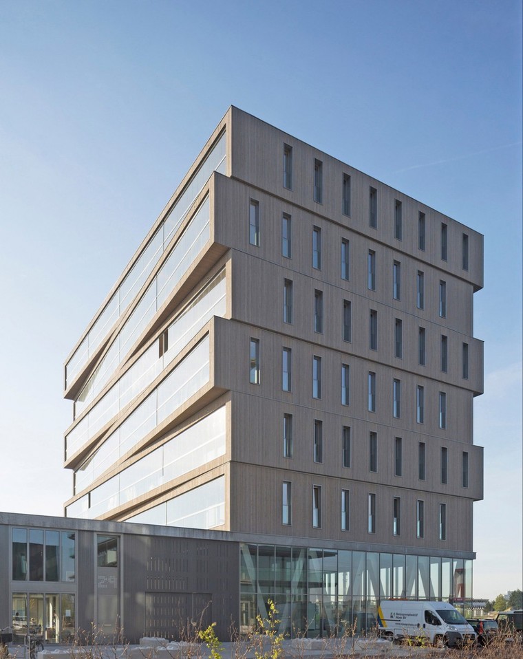 Patch 22 是荷兰最高的木质公寓住宅楼。不仅其外立面完全由木材组成,还有高达30米的木材承重结构,其木材柱,梁和墙都可从室内看到。为了满足防火规范的要求,木材在各个尺度上都有所扩大。当面临火灾时,外层的木头可以持续燃烧120分钟到炭化以保护内部的木结构。这个项目也是荷兰第一栋在高层可以尽享木材空间的建筑。