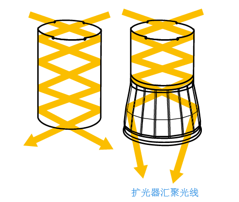在第一代扩光器的基础上,经过了几代的变革和研发,就有了M74DS昊明系列的扩光器,由36个反射面构成,不仅能实现光线汇聚,而且传输距离更远,减少侧墙上部的光通量和吊顶平面上的光线损失量。